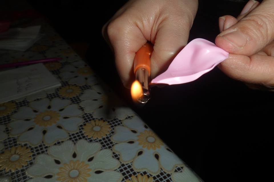 Ammorbidire la plastica vicino al fuoco e darle la forma di un petalo.
